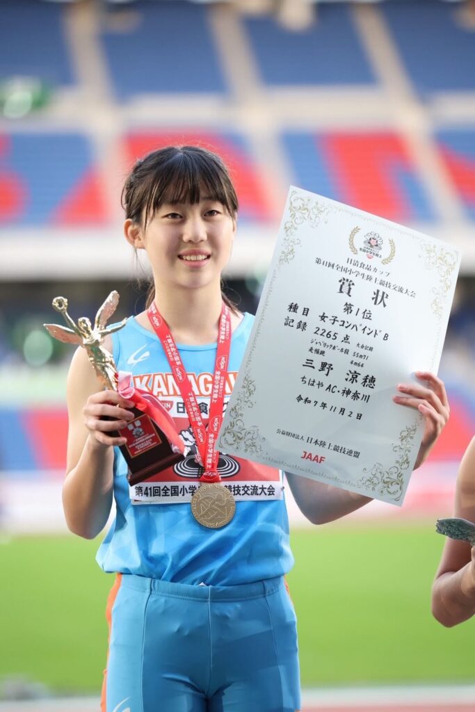 11月2日(日)、日産スタジアムで開催された「日清食品カップ 第41回全国小学生陸上競技交流大会」でちはや陸上クラブ所属の三野涼穂選手が共通女子コンバインドBに出場し、